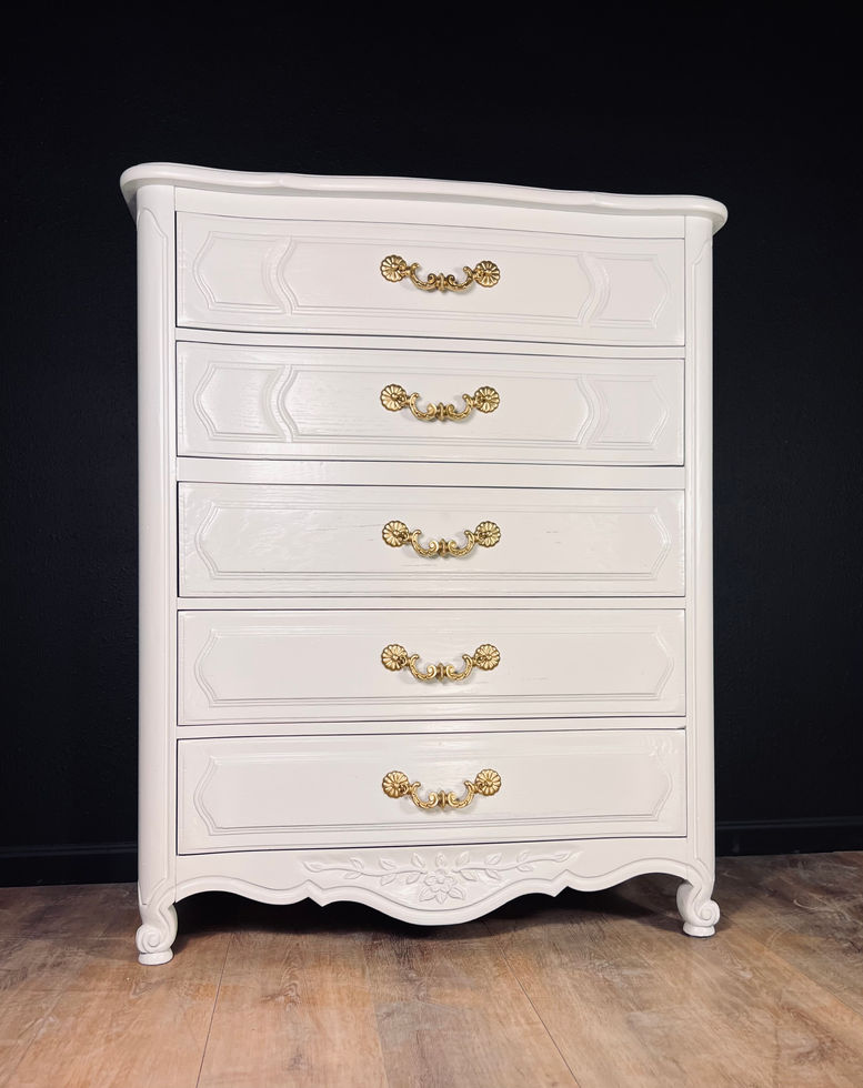 Timeless elegance meets refined craftsmanship in this stunning French Provincial chest. This beautiful 5-drawer chest has been professionally refinished in a soft classic white, highlighting its graceful curves, ornate detailing, and heirloom character.