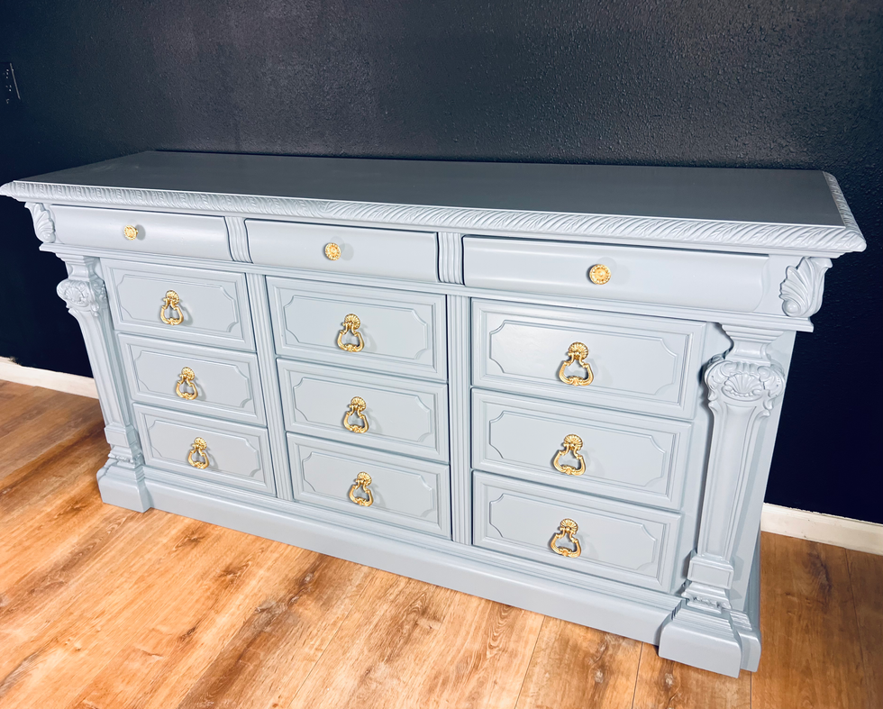 This large 12-drawer dresser is a true statement piece, featuring a grand silhouette, detailed molding, and beautiful original craftsmanship. The symmetrical drawer layout offers generous storage while maintaining a balanced, timeless design.